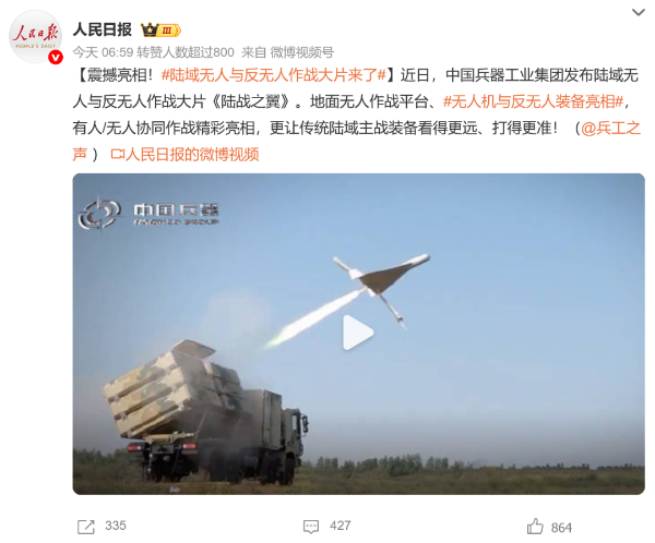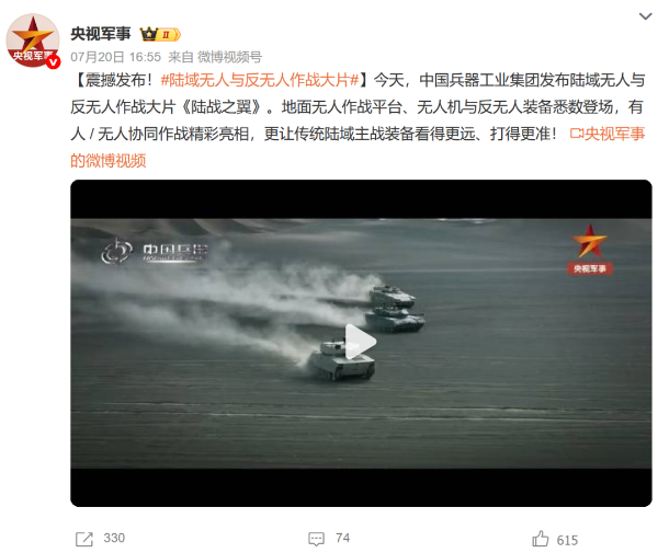7月21日,中國兵器工業(yè)集團有限公司在位于內(nèi)蒙古的某試驗場舉辦軍貿(mào)陸域無人與反無人作戰(zhàn)體系主題日活動,攜無人機、巡飛彈、反無人機等最新武器裝備登場亮相,展現(xiàn)了一場無人與反無人領(lǐng)域激烈對抗的實戰(zhàn)場景。中央主流媒體、地方媒體、知名網(wǎng)絡(luò)媒體,以及集團公司各宣傳平臺紛紛進行報道,多次登上熱搜,引發(fā)廣泛關(guān)注。 央視新聞頻道《新聞直播間》《東方時空》《24小時》、國防軍事頻道《正午國防軍事》《軍事報道》《國防軍事早報》、中文國際頻道《今日環(huán)球》、央視軍事新媒體等報道了集團公司軍貿(mào)陸域無人與反無人作戰(zhàn)體系首次公開實裝動態(tài)演示有關(guān)情況,重點介紹了無人與反無人作戰(zhàn)最新裝備。 央視新聞頻道《新聞直播間》:內(nèi)蒙古 軍貿(mào)陸域無人與反無人作戰(zhàn)最新裝備亮相 央視新聞頻道《新聞直播間》:內(nèi)蒙古 軍貿(mào)陸域無人與反無人作戰(zhàn)最新裝備亮相 記者探訪無人裝備展區(qū) 央視新聞頻道《新聞直播間》:軍貿(mào)陸域無人與反無人作戰(zhàn)最新裝備亮相·記者探訪 最強“盾牌” 反無人機系統(tǒng)新升級 人民日報微博、央視軍事微博、央視新聞客戶端、中國新聞網(wǎng)、中新社國是直通車抖音、環(huán)球網(wǎng)微博、環(huán)球時報(X平臺、英文版客戶端)、中國日報網(wǎng)、央視軍事報道微博、中國軍號微博、中央廣播電視總臺“空天逐夢”微信視頻號、共青團中央B站、國資小新微博等中央主流媒體、國家部委的新媒體播發(fā)集團公司陸域無人與反無人作戰(zhàn)大片等視頻作品。 人民日報微博 央視軍事微博 人民日報、新華網(wǎng)、央視軍事、央視新聞、中央廣播電視總臺中國之聲、中國新聞網(wǎng)、中國日報網(wǎng)、中國日報英文報刊《CHINA DAILY》、《科技日報》、光明日報客戶端、環(huán)球網(wǎng)、環(huán)球時報、人民日報海外版-海外網(wǎng)、央視網(wǎng)、小央視頻、參考消息、瞭望東方周刊、共青團中央、國資小新新媒體、新浪網(wǎng)、騰訊網(wǎng)、搜狐網(wǎng)、鳳凰網(wǎng)、網(wǎng)易網(wǎng)等中央主流媒體、國家部委的新媒體及知名網(wǎng)絡(luò)媒體對集團公司軍貿(mào)陸域無人與反無人作戰(zhàn)體系主題日活動進行了圖文、音頻、視頻報道。 央視軍事微信 人民日報微信 新華網(wǎng)微信 來源/各主流媒體 |